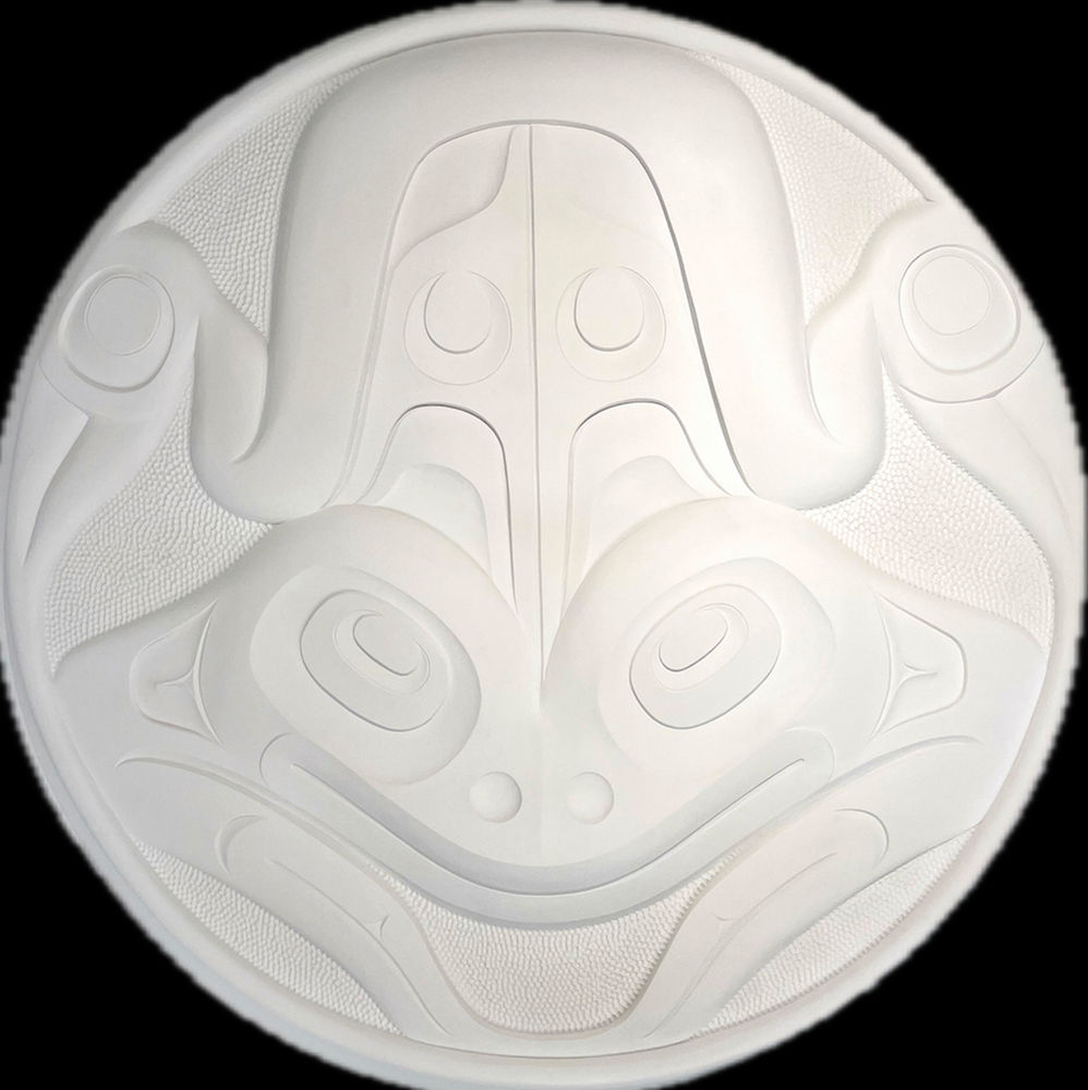With this piece I was excited to work with the extra depth in the material. Thanks to my dad for providing a good road map for me and guidance on this piece when I needed directions. This is one of the more sculptural panels that I have completed (the material allowing for the emphasis of three dimensional space, in addition to layout and design). The frog is one of my favourite beings to portray, and having the opportunity with this piece to express him from a different perspective was very enjoyable. During my work on this piece, my child was still in the oven, so to speak. We could feel a bum sticking out prominently through mum’s belly. After he was born my son retained this go-to position, and his likeness to Lil Froggy while curled up on his mum’s chest one day made me smile. - Kyran Yeomans