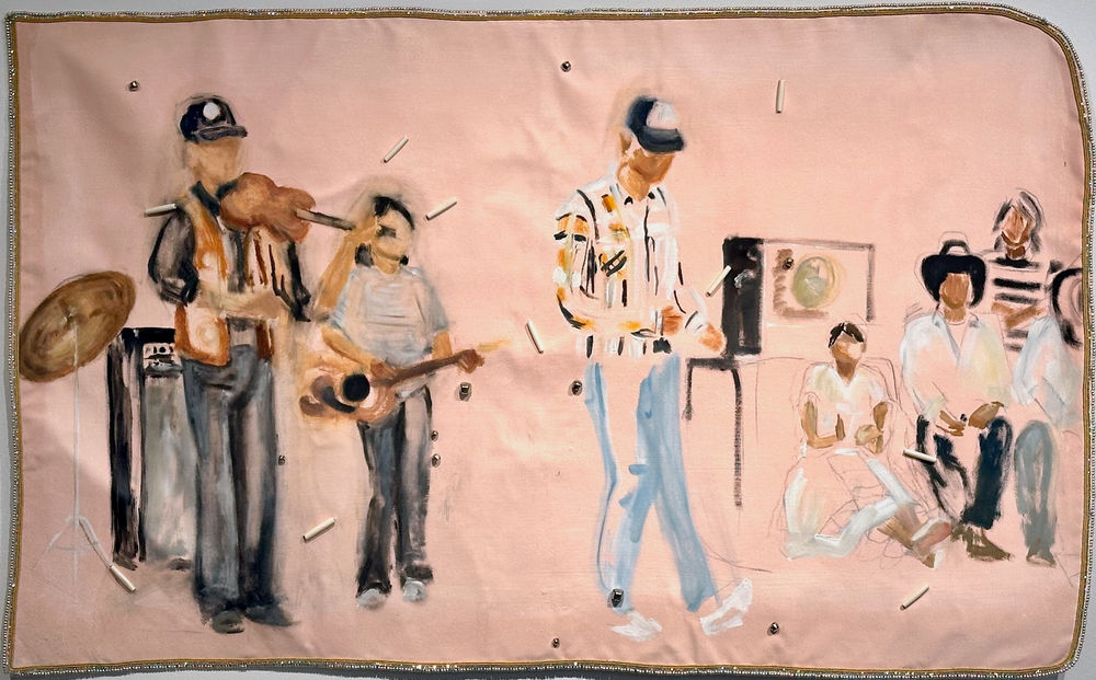 Artist statement: Across this painting you see a gathering on a stage, where my moshom fiddles, my auntie plays guitar, and my family members walk and take turns jigging. Jigging...